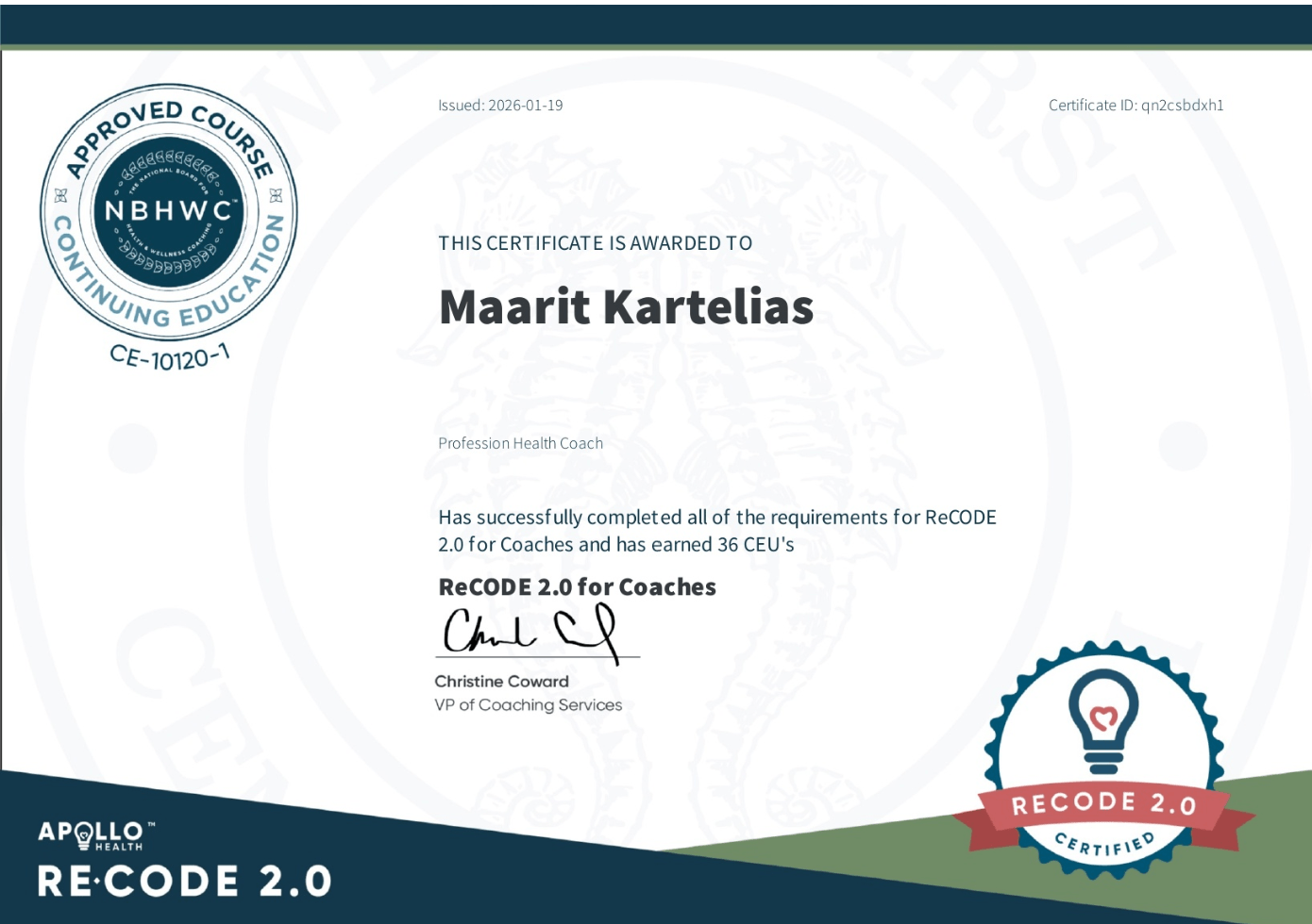 Syvensin osaamistani edelleen 2025-2026 aivoterveyteen ja kognitiivisten ongelmien juurisyihin kouluttautumalla ReCODE-menetelmään, joka keskittyy muistin heikkenemisen ja Alzheimerin taudin taustalla vaikuttavien tekijöiden tunnistamiseen ja korjaamiseen.